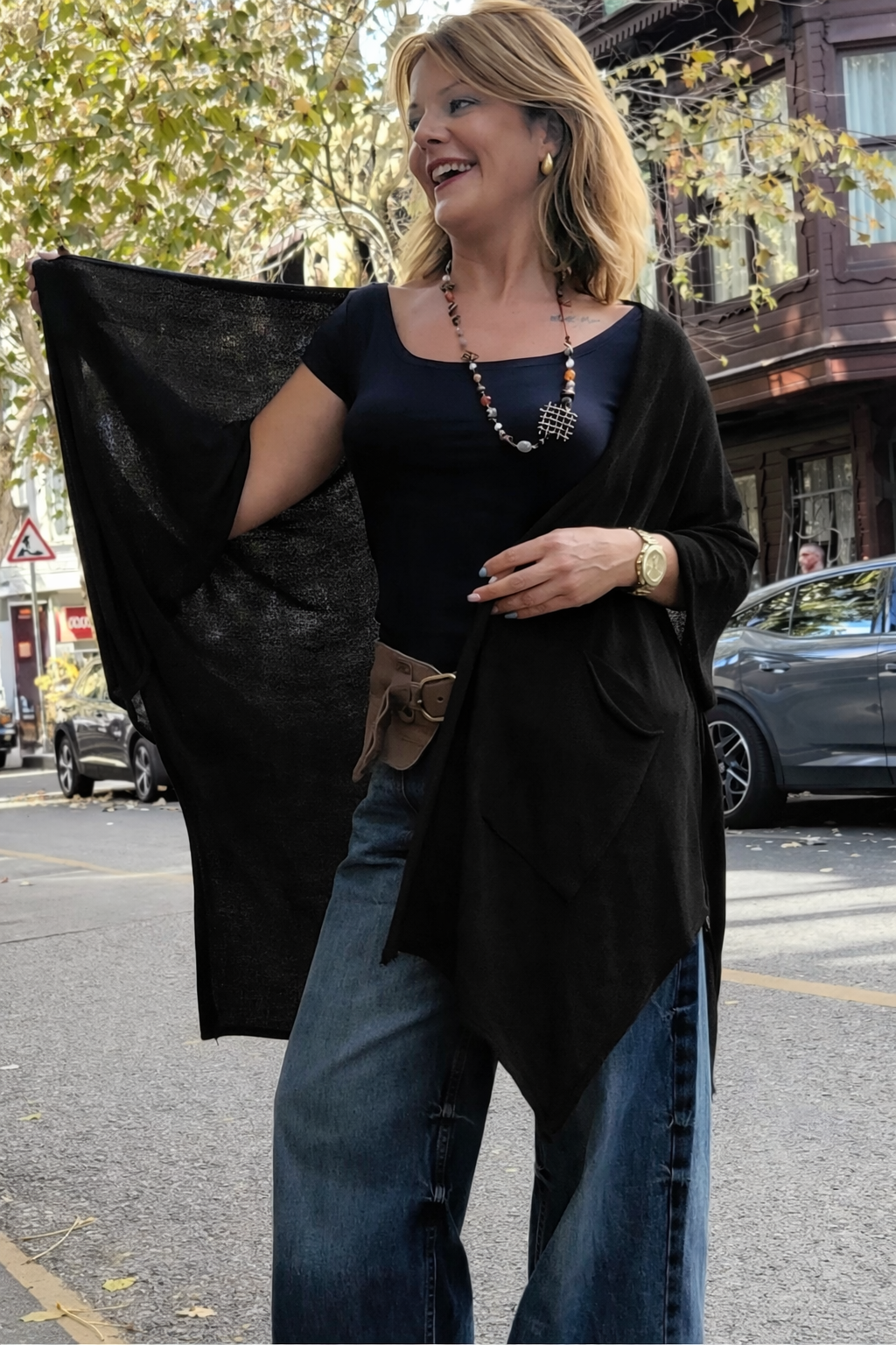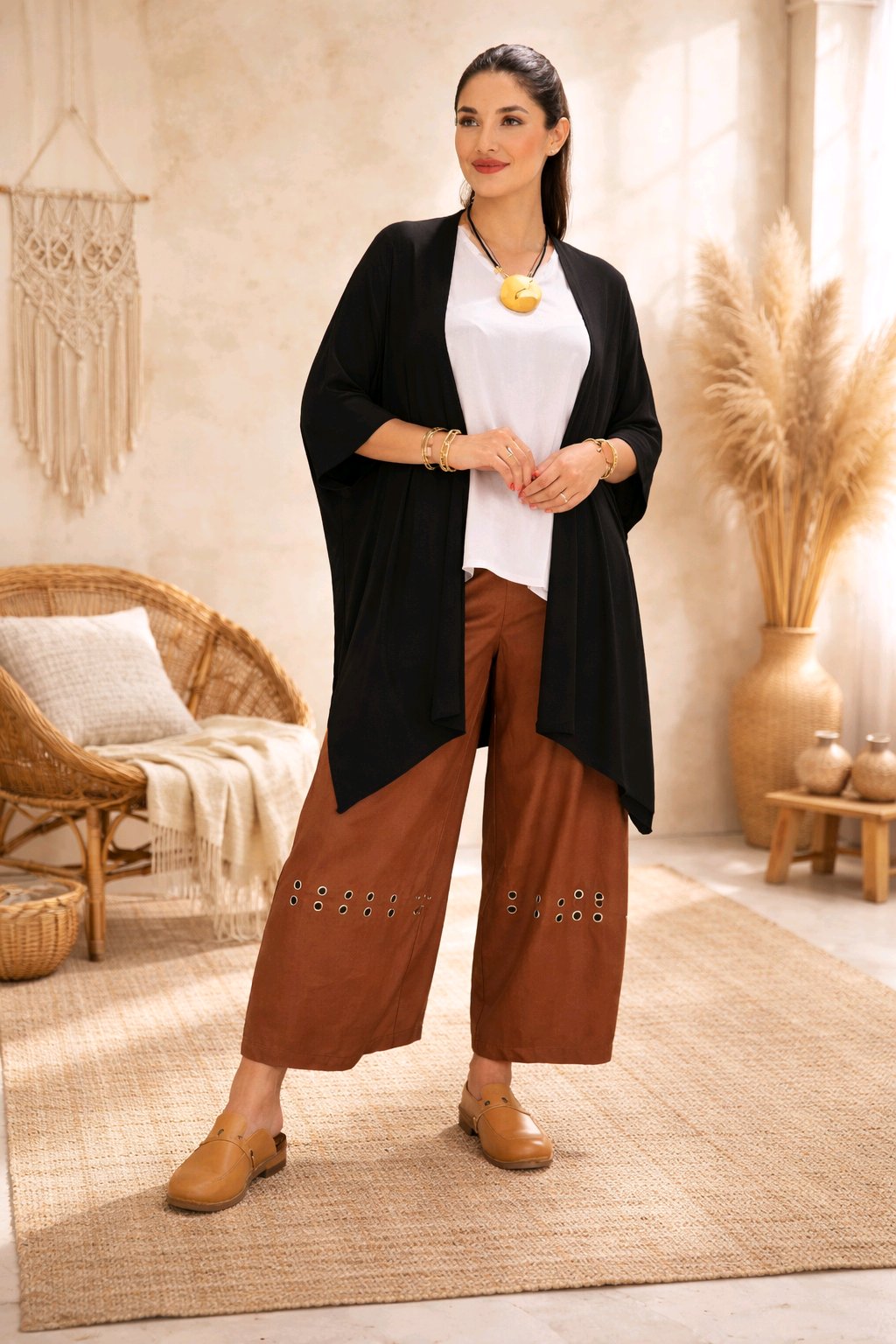 Αέρινη ζακέτα σε χαλαρή, ρευστή γραμμή που αγκαλιάζει το σώμα και δημιουργεί φυσική κίνηση σε κάθε βήμα.