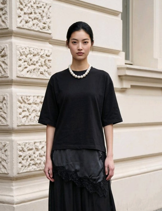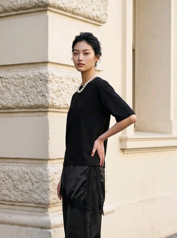 Γυναικεία βαμβακερή μπλούζα που συνδυάζει την άνεση του φυσικού υφάσματος με κομψές λεπτομέρειες σατέν και δαντέλας στο τελείωμα. Η minimal γραμμή της δημιουργεί ένα σύγχρονο και ευκολοφόρετο κομμάτι που μπορεί να φορεθεί από το πρωί έως το βράδυ.