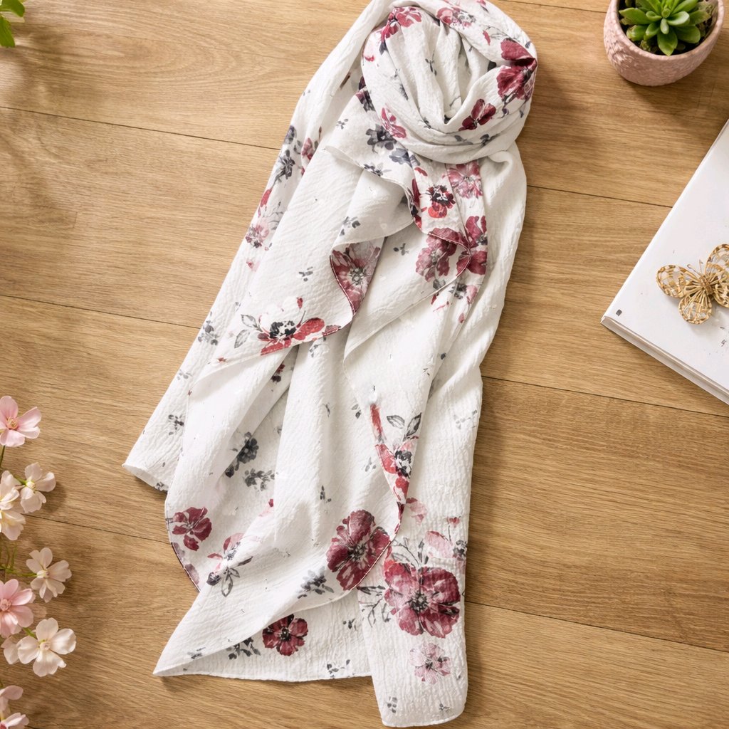 Το διακριτικό floral μοτίβο δημιουργεί ένα κομψό αποτέλεσμα που ταιριάζει ιδανικά τόσο σε καθημερινά όσο και σε πιο elegant outfits. Μπορεί να φορεθεί γύρω από τον λαιμό, στους ώμους ή ακόμα και ως αξεσουάρ σε τσάντα.