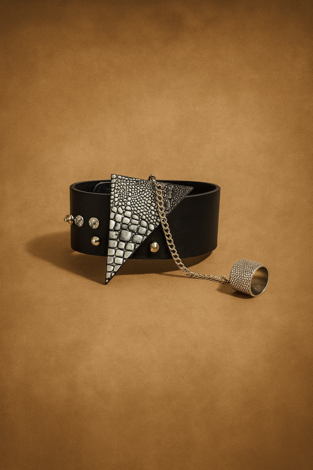 Δερμάτινο βραχιόλι σε μαύρο χρώμα με έντονο, σύγχρονο design. Διακοσμείται με ανάγλυφο μεταλλικό στοιχείο και λεπτομέρειες που προσθέτουν χαρακτήρα, ενώ το δαχτυλίδι συνδέεται με το βραχιόλι μέσω μεταλλικής αλυσίδας, δημιουργώντας ένα ενιαίο, statement κόσμημα.