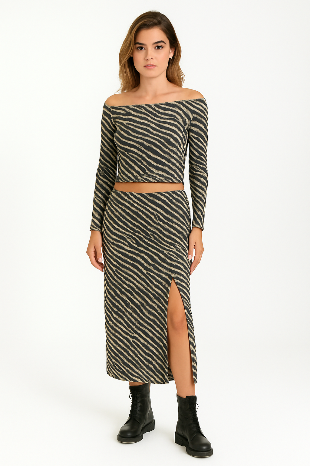 Το χαρακτηριστικό zebra μοτίβο κάνει το σύνολο ξεχωριστό, χωρίς να γίνεται υπερβολικό. Ένα outfit που φοριέται από πρωινές εμφανίσεις έως βραδινές εξόδους, απλά αλλάζοντας παπούτσια και αξεσουάρ.