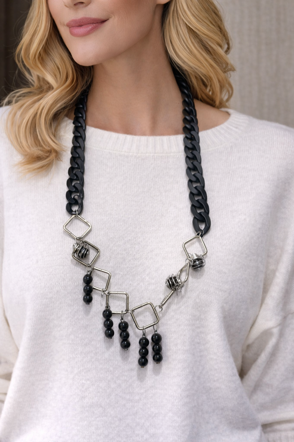 Το κολιέ διαθέτει μαύρη αλυσίδα από ελαφρύ, μη μεταλλικό υλικό, που προσφέρει έντονη εμφάνιση χωρίς βάρος και άνετη εφαρμογή στον λαιμό.