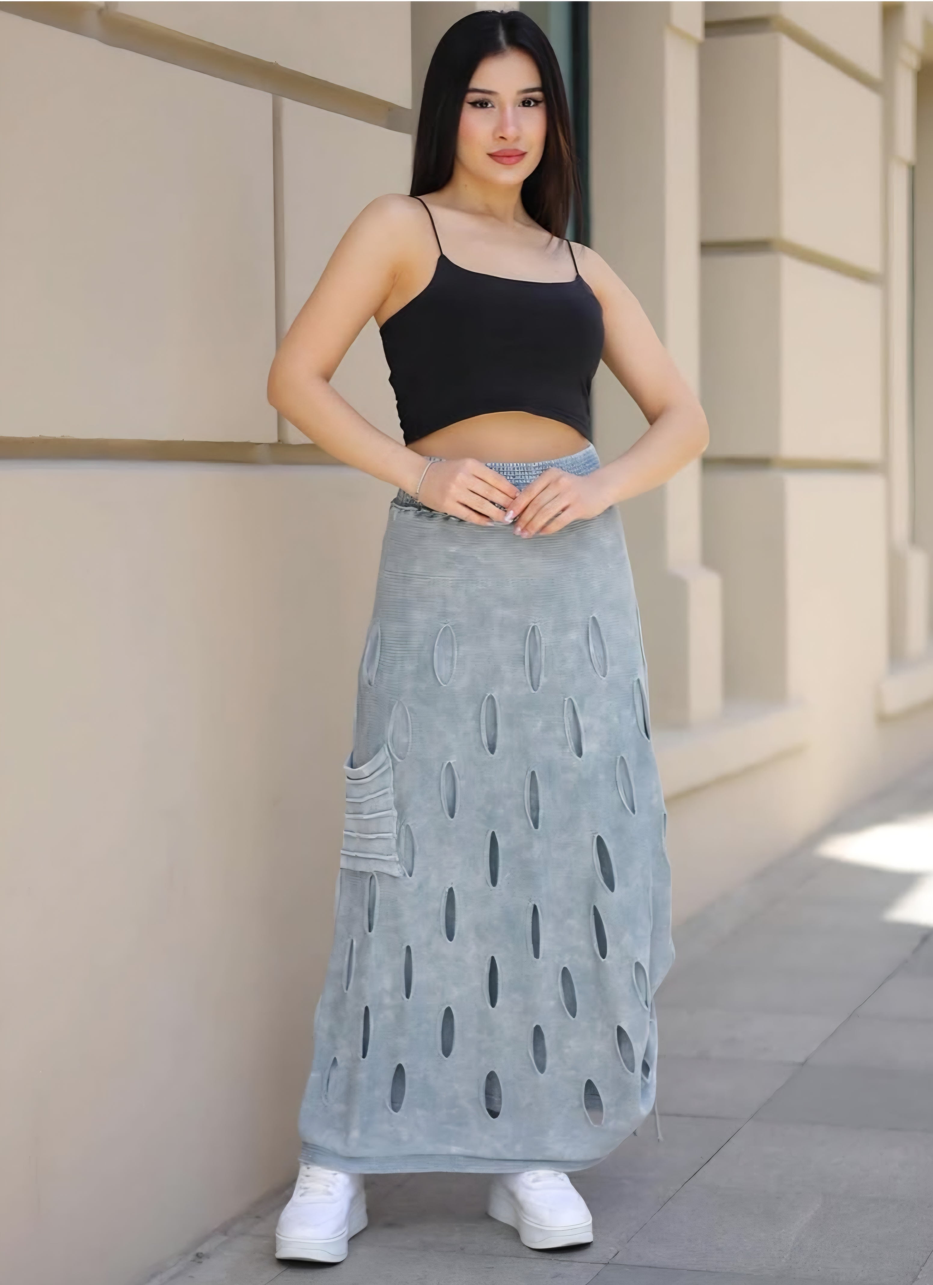 Αυτή η μακριά φούστα είναι κατασκευασμένη από 100% βαμβάκι και ξεχωρίζει με τις ιδιαίτερες λεπτομέρειες στο σχέδιο. Η άνετη γραμμή της προσφέρει ευκολία όλη την ημέρα, ενώ το μοντέρνο και boho στυλ της ολοκληρώνει κομψά κάθε εμφάνιση.